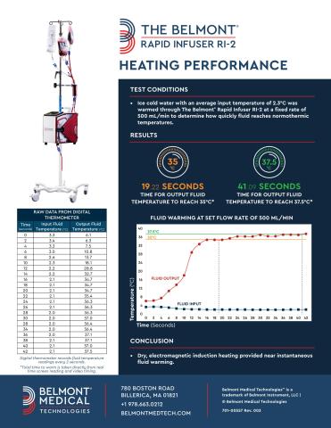 Summary of testing describing how quickly ice cold water was warmed to normothermia through The Belmont Rapid Infuser RI-2